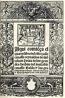 - Portada: «Aqui comiença el quarto libro del esforçado cavallero reynaldos de montaluan, que trata de los grandes hechos del inuencible cavallero Baldo, y las graciosas burlas de Cingar. Sacado de las obras del Mago Palagrio en nuestro común castellano».