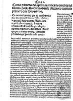 • Texto: (h.11v.-h.320r.) inc. «Canto primero dela primera cantica y comedia del divino poeta florentino dante aligero: o capitolo primero que todo es vno. [siguen 8 versos agrupados en lo alto, a la izquierda, con el comentario en prosa a la derecha y debajo, ocupando toda la pág.:] "En medio el camino que va nuestra vida | por una grand selva me fallo y obscura | o qual ella fuese quanto es cosa dura | dezirse, y la via derecha se olvida | renueva esta selva salvagia afligida | espanto en pensarla tan aspera y fuerte | que poco mas es amarga la muerte | y el miedo que pone su triste venida"»; (h. 320r.) expl. «Asy retornamos en el claro mundo | sin cura tener de descanso y reposo | salimos del brabo logar y penoso | el yba primero tras el yo segundo | dexamos alegres el ciego profundo | por un boqueron vi las cosas tan bellas | por donde salimos aver las estrellas | que pintan el cielo y le fazen jocundo». (h.v.-h.r.)